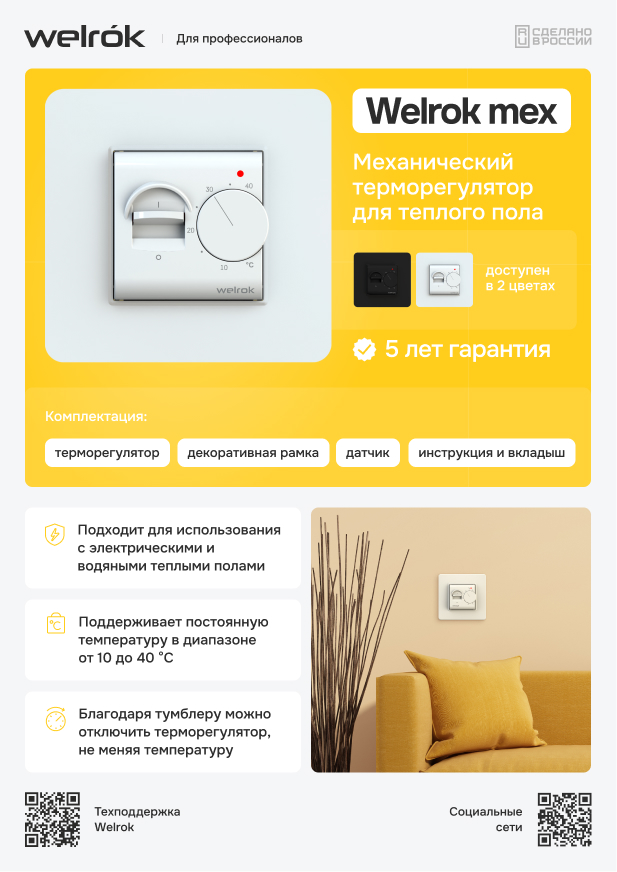 Welrok mex — это надежный механический терморегулятор, оснащенный выключателем, который идеально подходит для систем теплого пола. С помощью тумблера вы можете отключить термостат, не меняя заданную температуру.