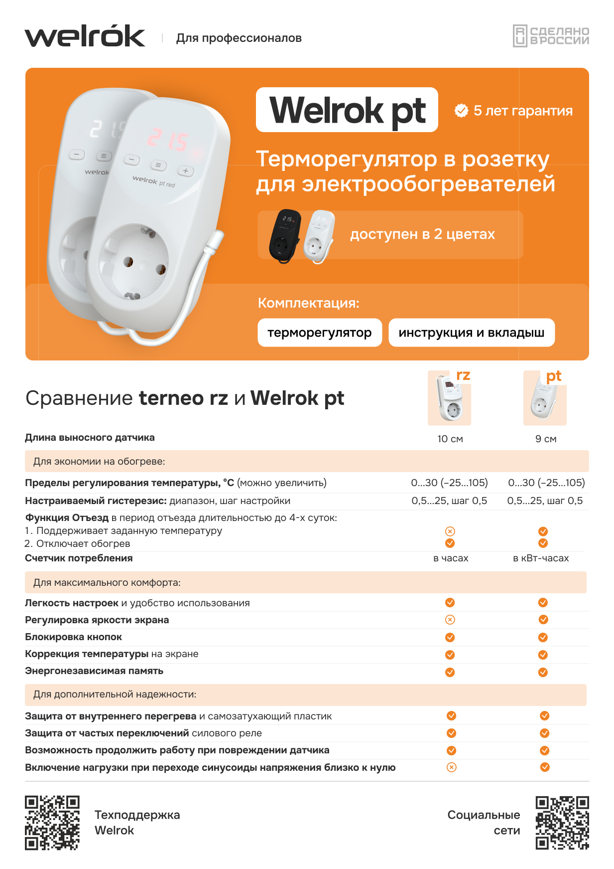 Терморегулятор Welrok pt предназначен для управления любыми электрическими обогревателями мощностью до 3000 ВА и обеспечивает комфортную температуру в помещении.